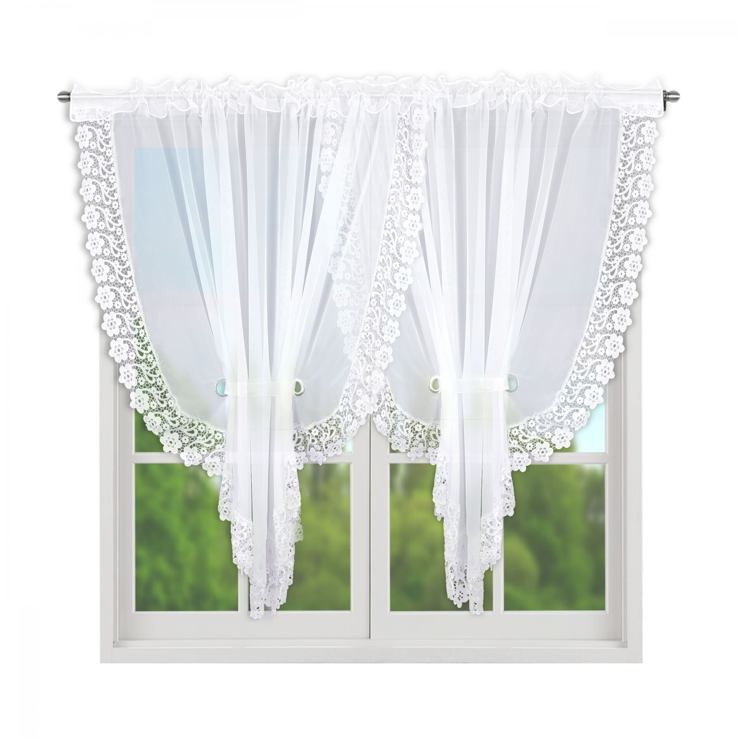 Zestaw dwóch eleganckich firan z woalu (firany są połączone). W zestawie również eleganckie podwiązki do upięcia firan. Firany do zawieszenia bezpośrednio na karniszu (posiadają tunel), bądź na żakach, uszyte są z taśmą marszczącą. Firany wykonane są z najwyższej jakości przędzy poliestrowej. Stanowią doskonały element dekoracyjny okien.