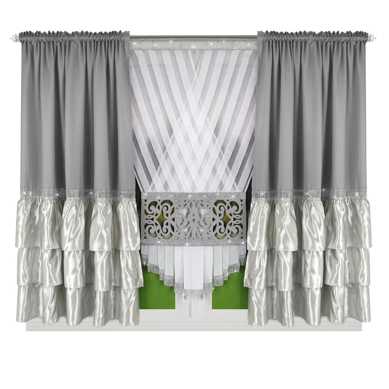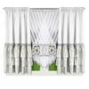 Ten stylowy zestaw składa się z trzech części: jednej firany i dwóch zasłon. Wszystkie części są pięknie zszyte na taśmie marszczącej, co dodaje uroku i ułatwia montaż. Możesz spiąć firanę za pomocą dołączonej taśmy z błyszczącymi cyrkoniami, tworząc wyjątkowy efekt, który przyciąga wzrok.